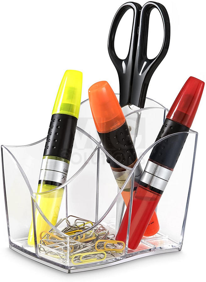 4 compartimentos para coletar e guarde todos os acessórios de escritório. Capacidade: 45 lápis + 1 caixa solta. Estabilidade perfeita e pegada pequena. Poliestireno reciclável à prova de choque. Dim. 118 x 89 H 98 mm
