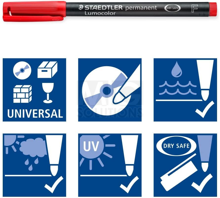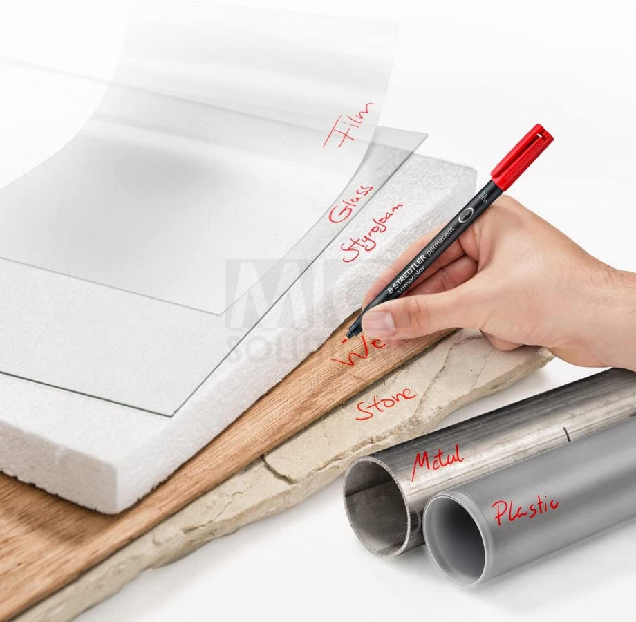 Caneta universal para quase todas as superfícies Suitable for overhead projection Excelente resistência à água e à sujidade em quase todas as superfícies Seca em segundos, por isso é ideal para utilizadores esquerdinos Tinta permanente, inodora Resistentes à ação da luz: preta e castanha A cor preta resiste à acção do tempo Exclusiva caixa STAEDTLER Corpo e tampa em polipropileno (PP) garantem uma longa duração DRY SAFE: Pode permanecer destapado durante dias sem secar (Norma ISO 554) Airplane-safe: sistema automático de equalização de pressão, previne o derrame enquanto a bordo de aviões Cores altamente brilhantes Espessura do traço fina de aprox 0.6 mm Recarregável