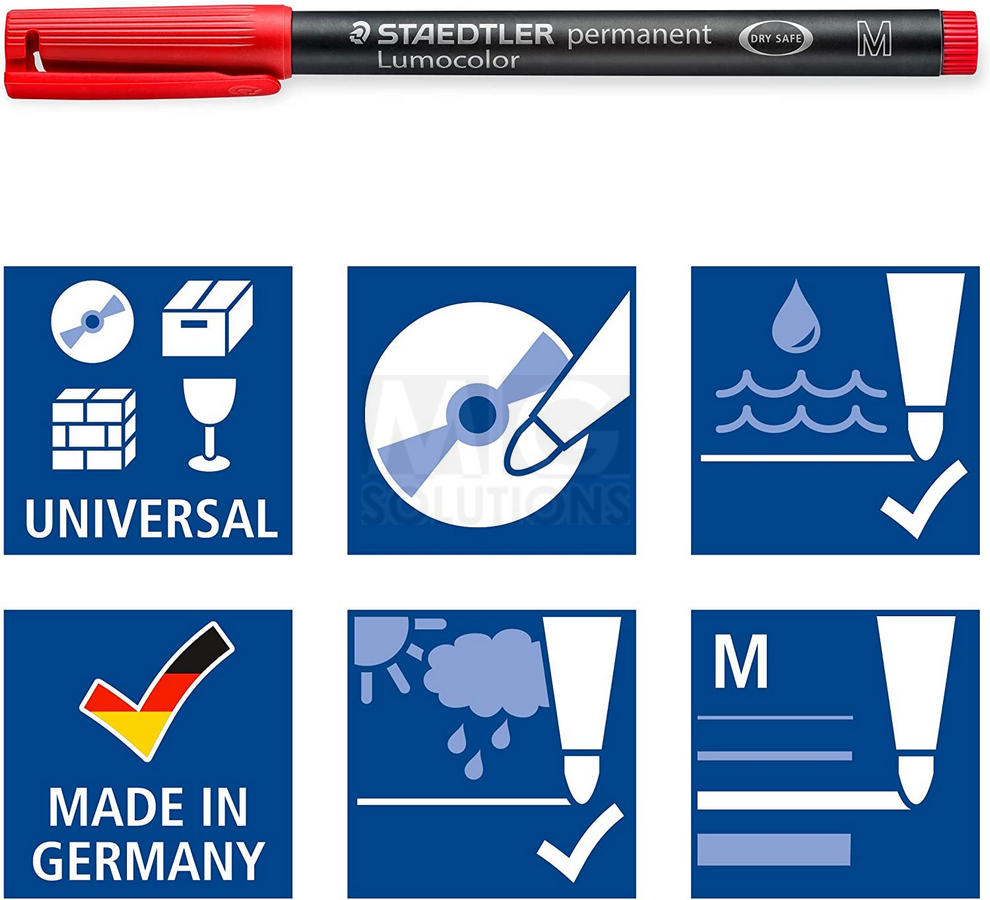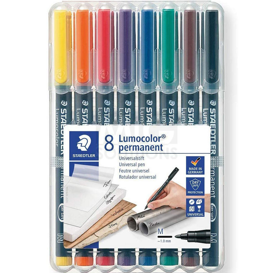 Caneta universal para quase todas as superfícies Suitable for overhead projection Também para CD/DVD Excelente resistência à água e à sujidade em quase todas as superfícies Seca em segundos, por isso é ideal para utilizadores esquerdinos Tinta permanente, inodora Resistentes à ação da luz: preta e castanha A cor preta resiste à acção do tempo Exclusiva caixa STAEDTLER Corpo e tampa em polipropileno (PP) garantem uma longa duração DRY SAFE: Pode permanecer destapado durante dias sem secar (Norma ISO 554) Airplane-safe: sistema automático de equalização de pressão, previne o derrame enquanto a bordo de aviões Cores altamente brilhantes Espessura do traço média de aprox 1.0 mm Recarregável